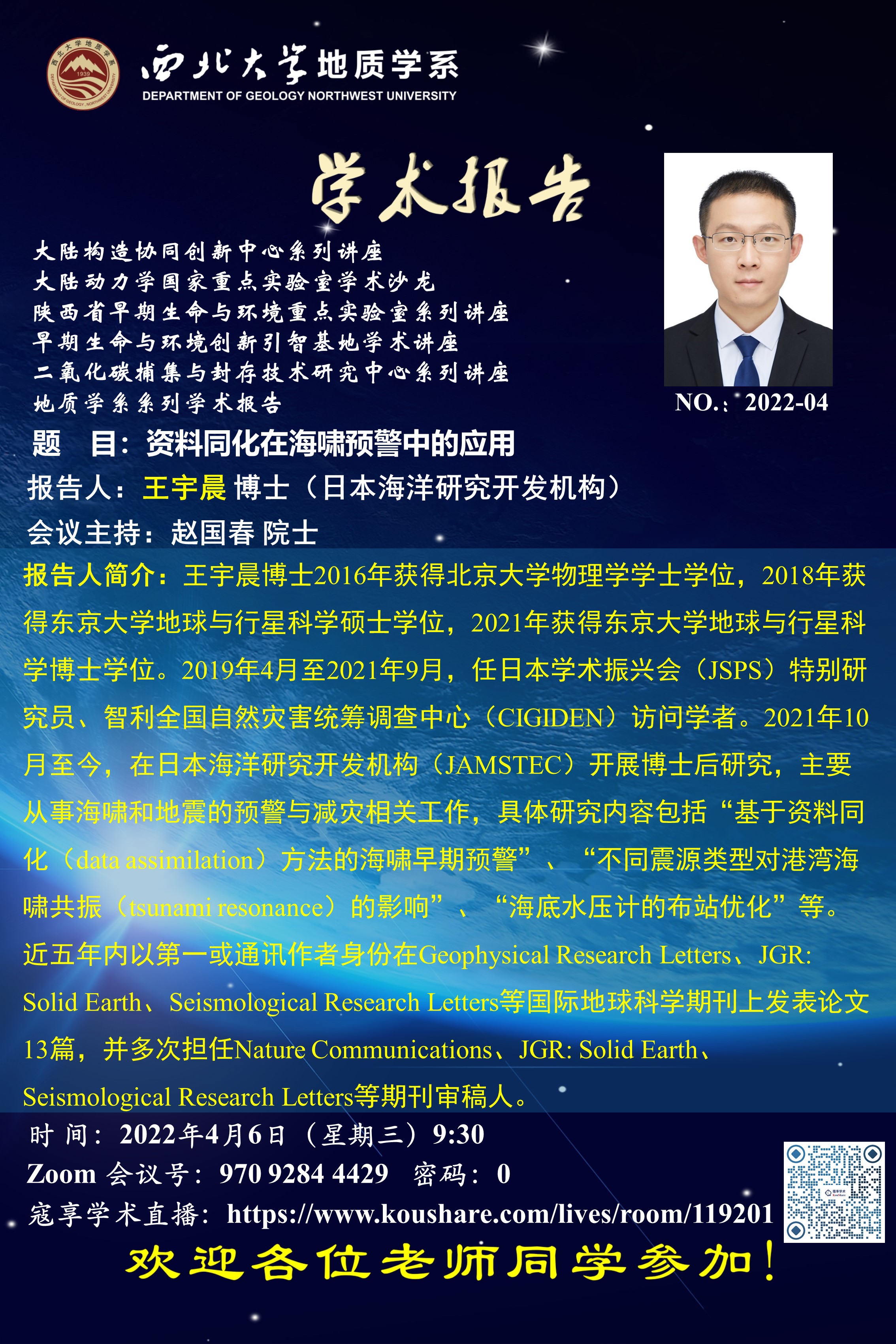 报告人简介:王宇晨博士2016年获得北京大学物理学学士学位,2018年获得东京大学地球与行星科学硕士学位,2021年获得东京大学地球与行星科学博士学位。2019年4月至2021年9月,任日本学术振兴会(JSPS)特别研究员、智利全国自然灾害统筹调查中心(CIGIDEN)访问学者。2021年10月至今,在日本海洋研究开发机构(JAMSTEC)开展博士后研究,主要从事海啸和地震的预警与减灾相关工作,具体研究内容包括“基于资料同化(data assimilation)方法的海啸早期预警”、“不同震源类型对港湾海啸共振(tsunami resonance)的影响”、“海底水压计的布站优化”等。近五年内以第一或通讯作者身份在Geophysical Research Letters、JGR: Solid Earth、Seismological Research Letters等国际地球科学期刊上发表论文13篇,并多次担任Nature Communications、JGR: Solid Earth、Seismological Research Letters等期刊审稿人。